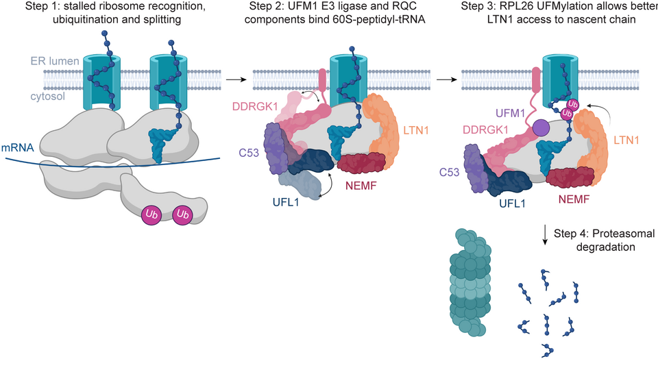Together, these findings establish a unified mechanistic model in which canonical ribosome surveillance factors initiate ribosome rescue, while UFMylation reshapes ER-bound ribosomes to enable full clearance of stalled nascent chains by the RQC. Rather than acting independently, the two pathways function as a coordinated system that maintains protein homeostasis during membrane-associated translation and prevents the accumulation of potentially toxic intermediates. By revealing how cells resolve ribosome traffic jams at the ER, the study clarifies a long-standing gap in our understanding of translation quality control. As first author Aleksandra Anisimova summarizes: “Cells constantly generate these stalled ribosomal intermediates in the background, and only when the clearance machinery is disrupted do we realize how essential this process really is.”