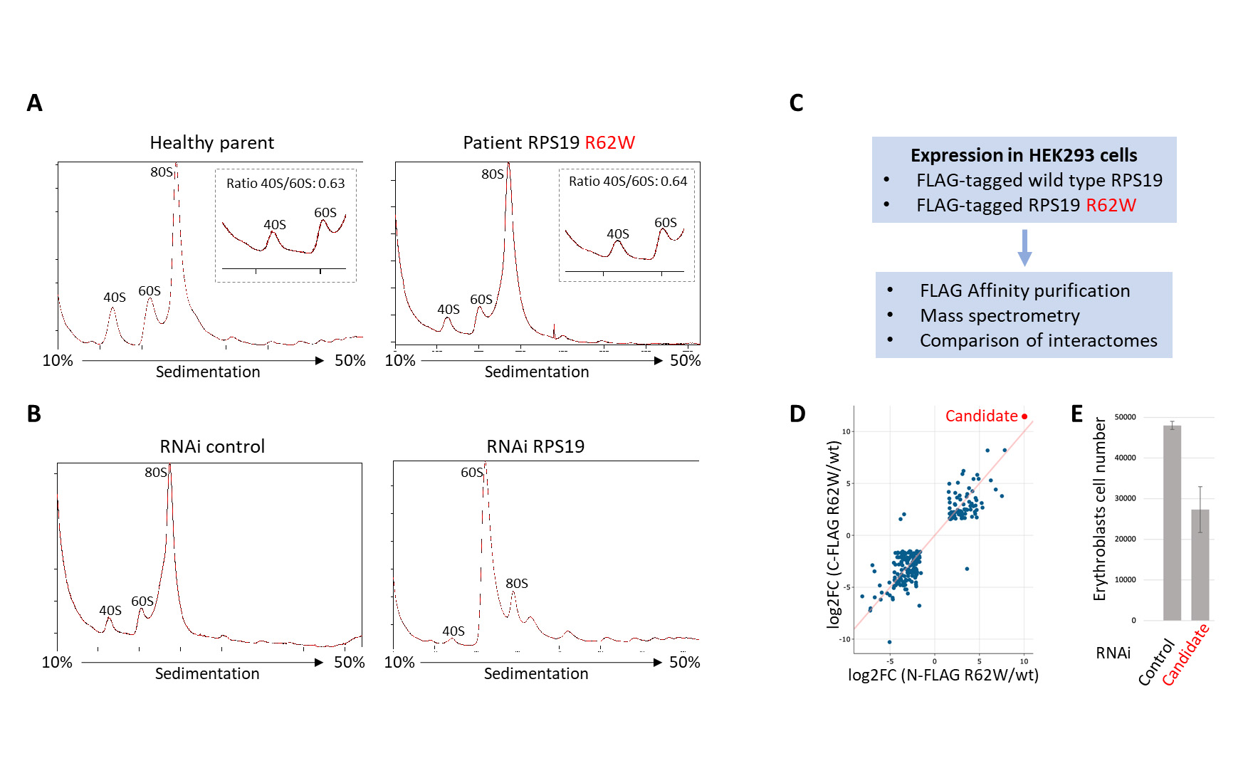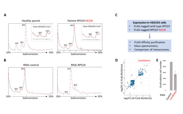 Molecular mechanisms underpinning Diamond-Blackfan Anemia Syndrome (DBAS), a disease characterized by the absence of red blood cells, remain elusive. Because mutations causing DBAS mainly occur in ribosomal proteins, researchers define DBAS as a “ribosomopathy”. We are interested in a Viennese family harboring a R62W missense mutation in RPS19. Polysome analysis of PBMCs (Peripheral Blood Mononuclear Cells) reveals no differences between affected and non-affected members (A). In contrast, when RPS19 is depleted in HeLa cells via RNAi, we detect severely reduced levels of the 40S ribosomal subunits (B). Through the expression of FLAG-tagged RPS19 wild type and R62W mutant followed by FLAG affinity purification and mass spectrometry in HEK293 cells (C), we have identified proteins specifically binding to RPS19 R62W (D). Depleting a top candidate in erythroblasts impairs proliferation or differentiation (E). Please see www.dbaexperiment.org.