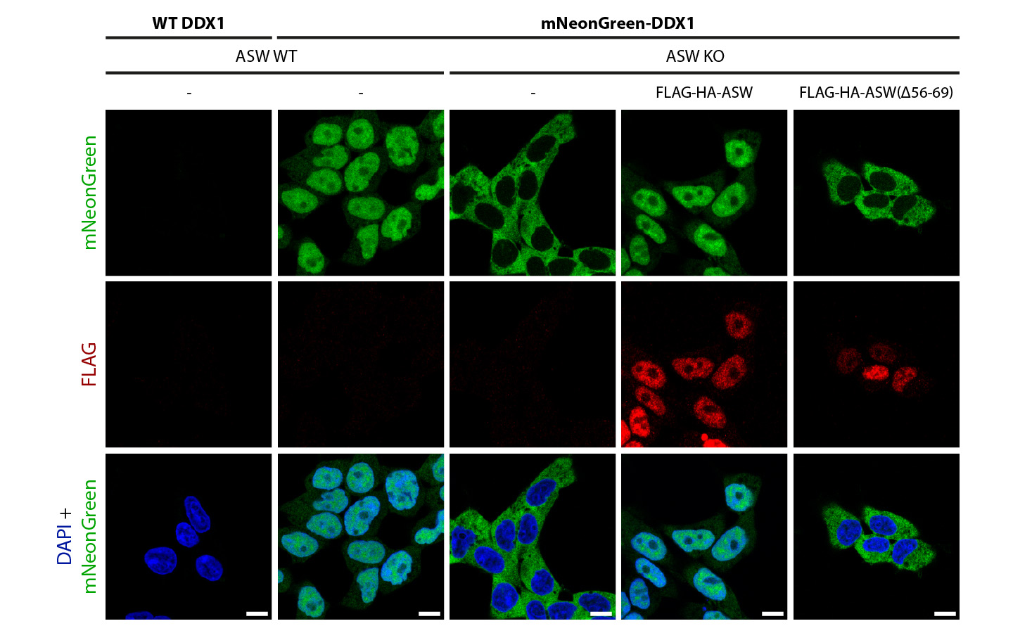 We have identified the function of Ashwin, the smallest and least studied subunit of the tRNA ligase complex (tRNA-LC). Ashwin contains a dual nuclear localization signal that allows the tRNA-LC to reach the nucleus and support pre-tRNA splicing. Ashwin displays exquisite specificity towards isoforms of the tRNA-LC containing FAM98B, rather than FAM98A or FAM98C. We envision Ashwin to have evolved to provide the tRNA-LC with a dual localization: nuclear, to splice pre-tRNAs, and cytoplasmic, to splice the mRNA encoding the transcription factor XBP1, essential during UPR. In the picture, fluorescent DDX1 within the tRNA-LC reaches the nucleus in wild type (WT) cells but not in cells where the Ashwin gene has been deleted. Expressing WT Ashwin sends the tRNA-LC back to the nucleus, but a mutant version of Ashwin, unable to associate with the tRNA-LC (aa 56-69 deleted), fails to do so.